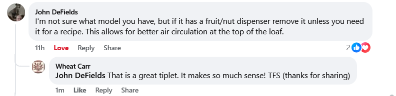 “I’m not sure what model you have, but if it has a fruit/nut dispenser remove it unless you need it for a recipe. This allows for better air circulation at the top of the loaf.”